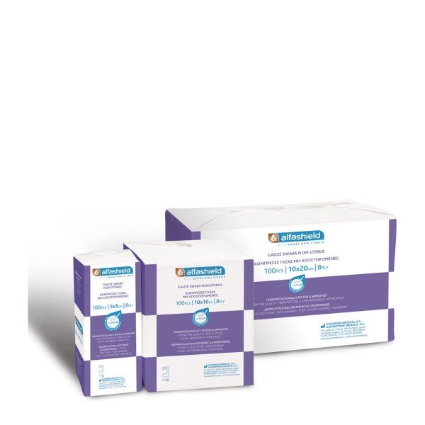 Οι μη αποστειρωμένες γάζες ALFA GAUZE/ Alfashield κατασκευάζονται από 100% άριστης ποιότητας βαμβάκι για μέγιστη ασφάλεια και προστασία. Είναι υδρόφιλες, μεγάλης απορροφητικότητας, άοσμες, χωρίς κατάλοιπα λευκάνσεως και με διπλωμένα άκρα.