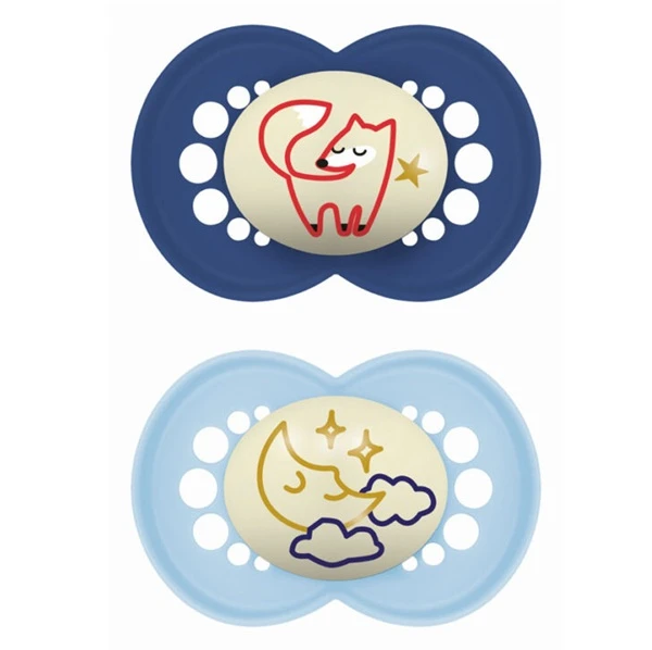 Το κάθε τεμάχιο διαθέτει λεπτό, αεροπερατό σχέδιο ασπίδας με ανοίγματα αερισμού για να μειώνεται η συγκράτηση υγρασίας γύρω από το στόμα, ενώ το κουμπί έχει κρυσταλλική δομή που αποθηκεύει φως και φωσφορίζεται στο σκοτάδι ώστε να εντοπίζεται εύκολα το βράδυ. Οι πιπίλες έχουν σχεδιαστεί με έμφαση στην ασφάλεια και την άνεση και συνήθως παρέχονται με θήκη αποστείρωσης για γρήγορη αποστείρωση στο μικροκύμα.